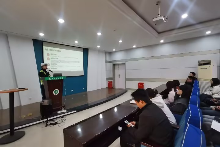 本次讲座以“普及交通法规,筑牢安全防线”为主题,内容丰富且针对性强。首先,陈阳交警大队民警围绕道路交通安全相关法律法规,结合高校学生出行特点,从步行、骑行、乘车等常见场景入手,详细讲解了交通违法行为的危害及后果,引导学生树立“文明出行、守法出行”的理念。随后,活动通过“以‘案’授课”的形式,组织学生观看交通安全警示教育视频,民警结合典型事故案例,深入剖析了超速、闯红灯、骑行电动车不戴安全头盔等违法行为引发事故的原因,用真实案例敲响安全警钟,让学生直观感受交通安全的重要性。